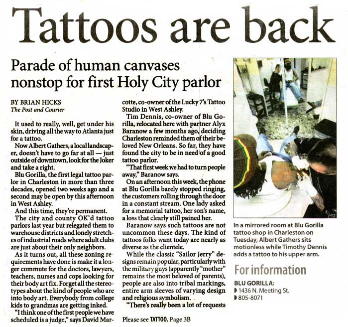 Blu Gorilla Tattoo Telephone(843) 805-8071 Emailinfo@blugorilla.com Location1409 King Street Charleston, SC 29403